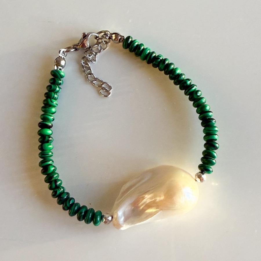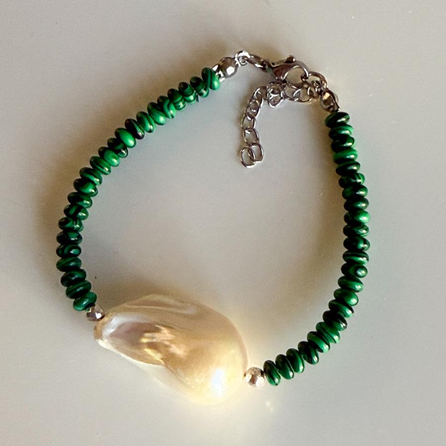 - Malzeme: Premium kalite iri barok inci, malahit taşı ve hematit taşı kullanılarak tasarlanmıştır.