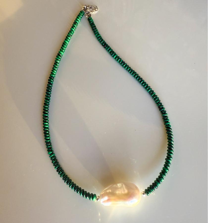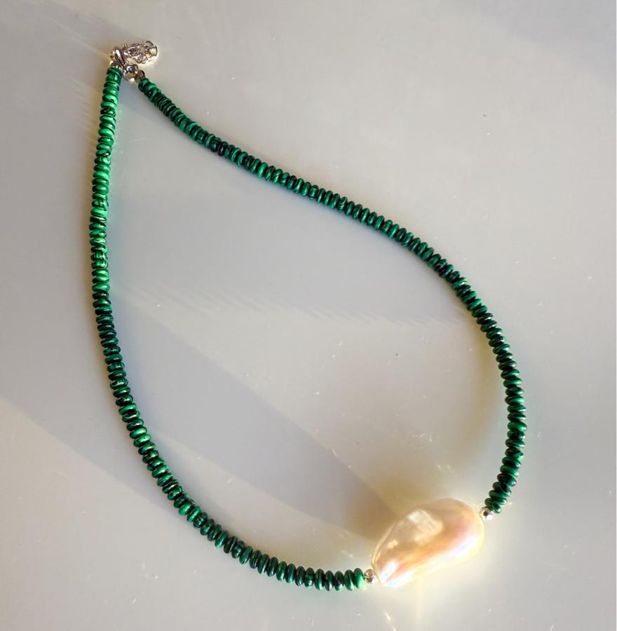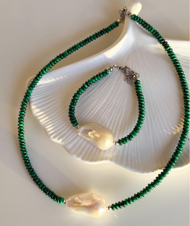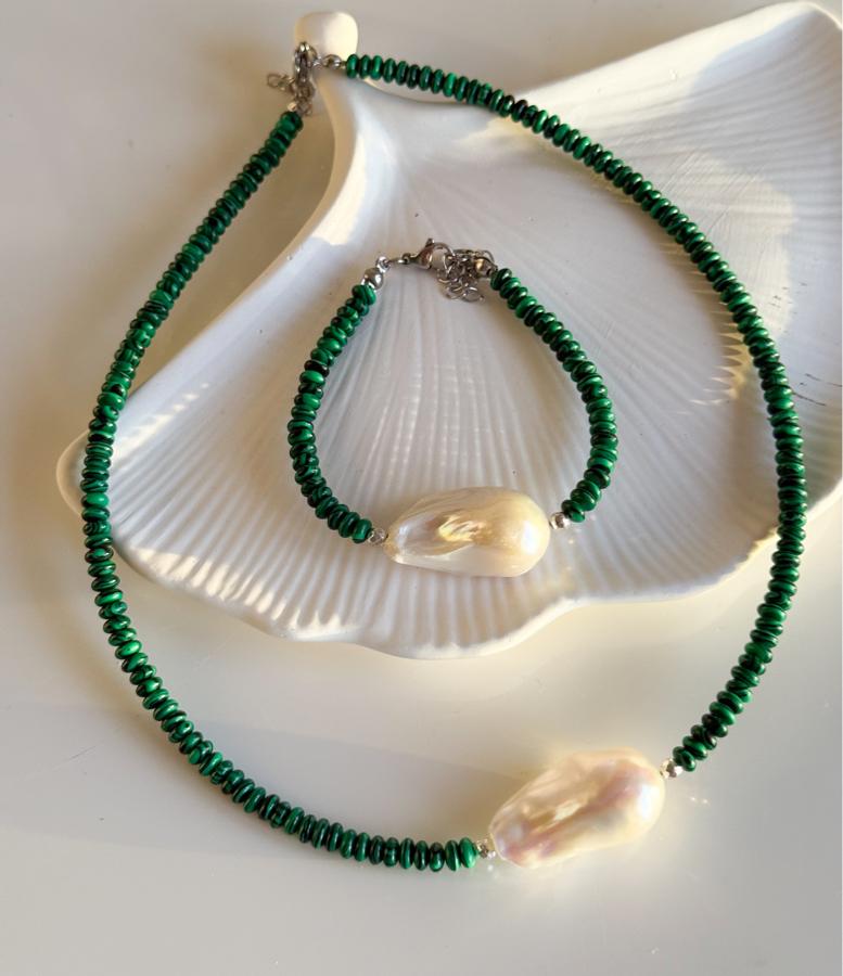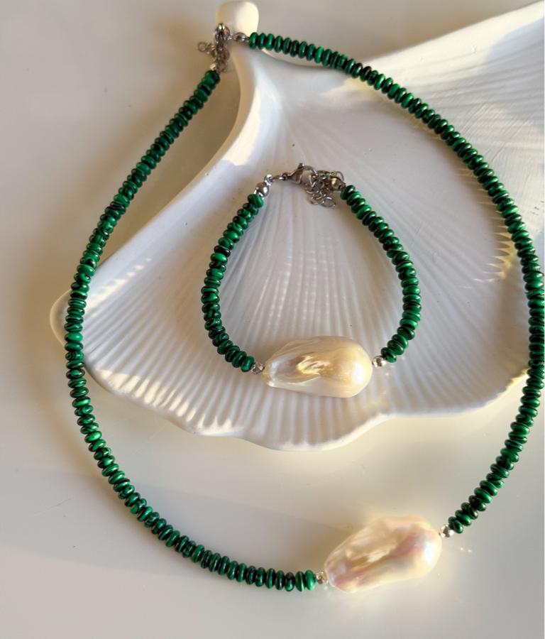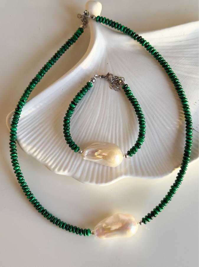 - Malzeme: Premium kalite iri barok inci, malahit taşı ve hematit taşı kullanılarak tasarlanmıştır.
