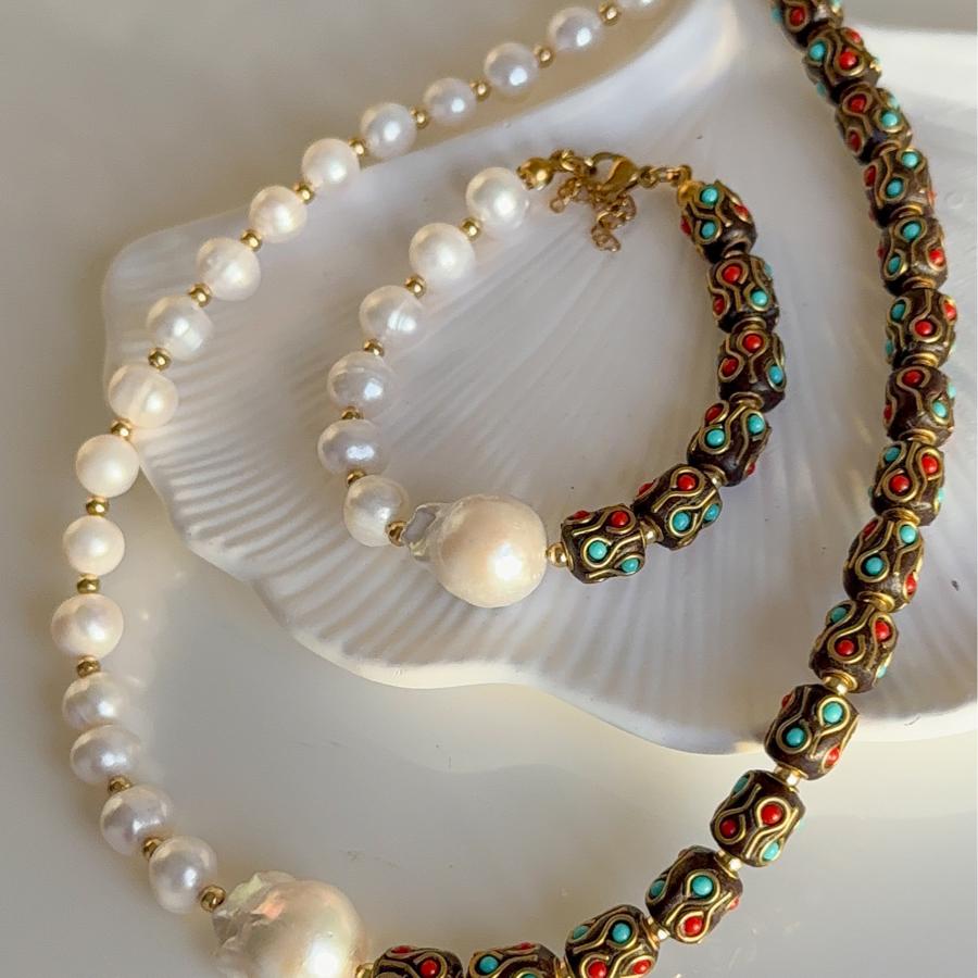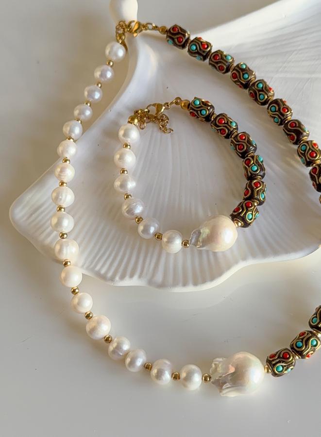 - Malzeme: Premium kalite tohum barok inci, yuvarlak inci ve materyali pirinç nepal boncuğu(üzerindeki boyama tamamen el boyamasıdır) kullanılarak tasarlanmıştır.